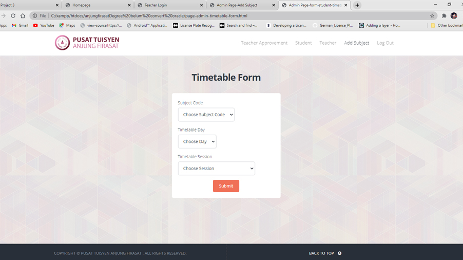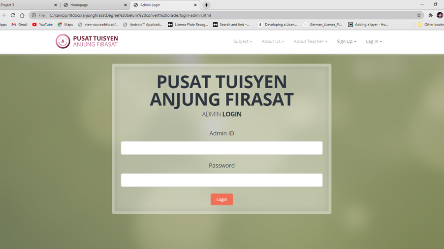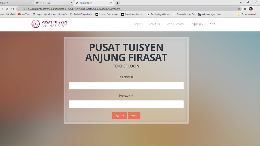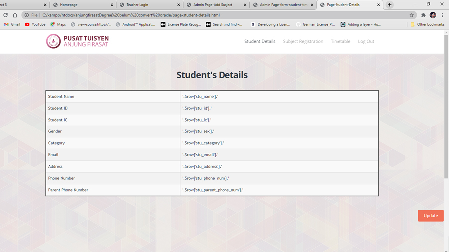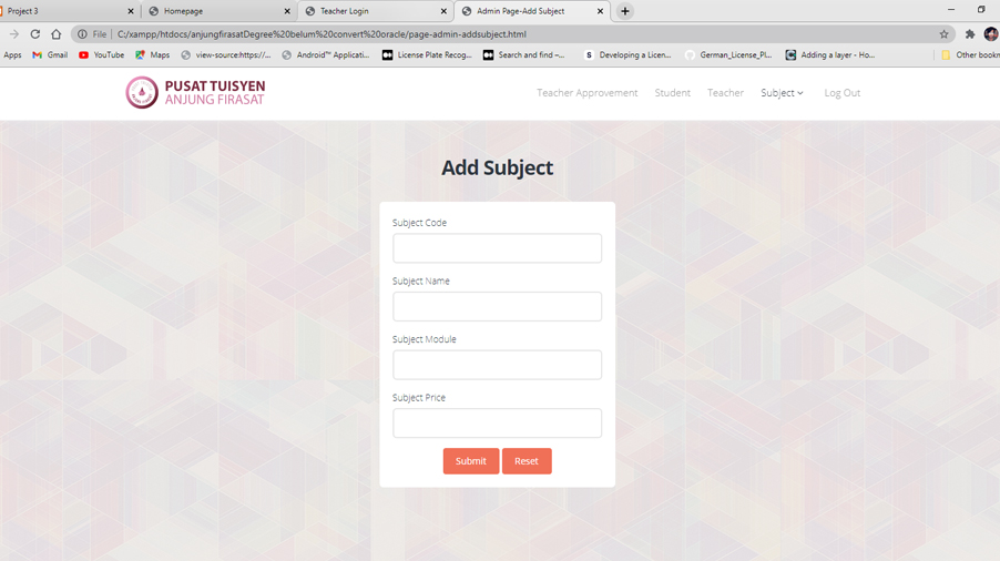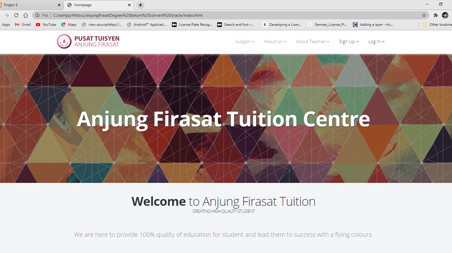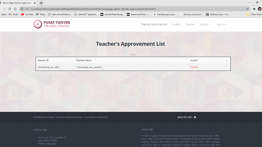 This is a tuition management system that involved three users which are admin, teacher and student. The system provide a validation system for a teacher who want to join teaching in the tuition center. It provides a timetable function that will managed by admin, who can also add a new subject into the system. PHP and mySQL are used to develop the system.